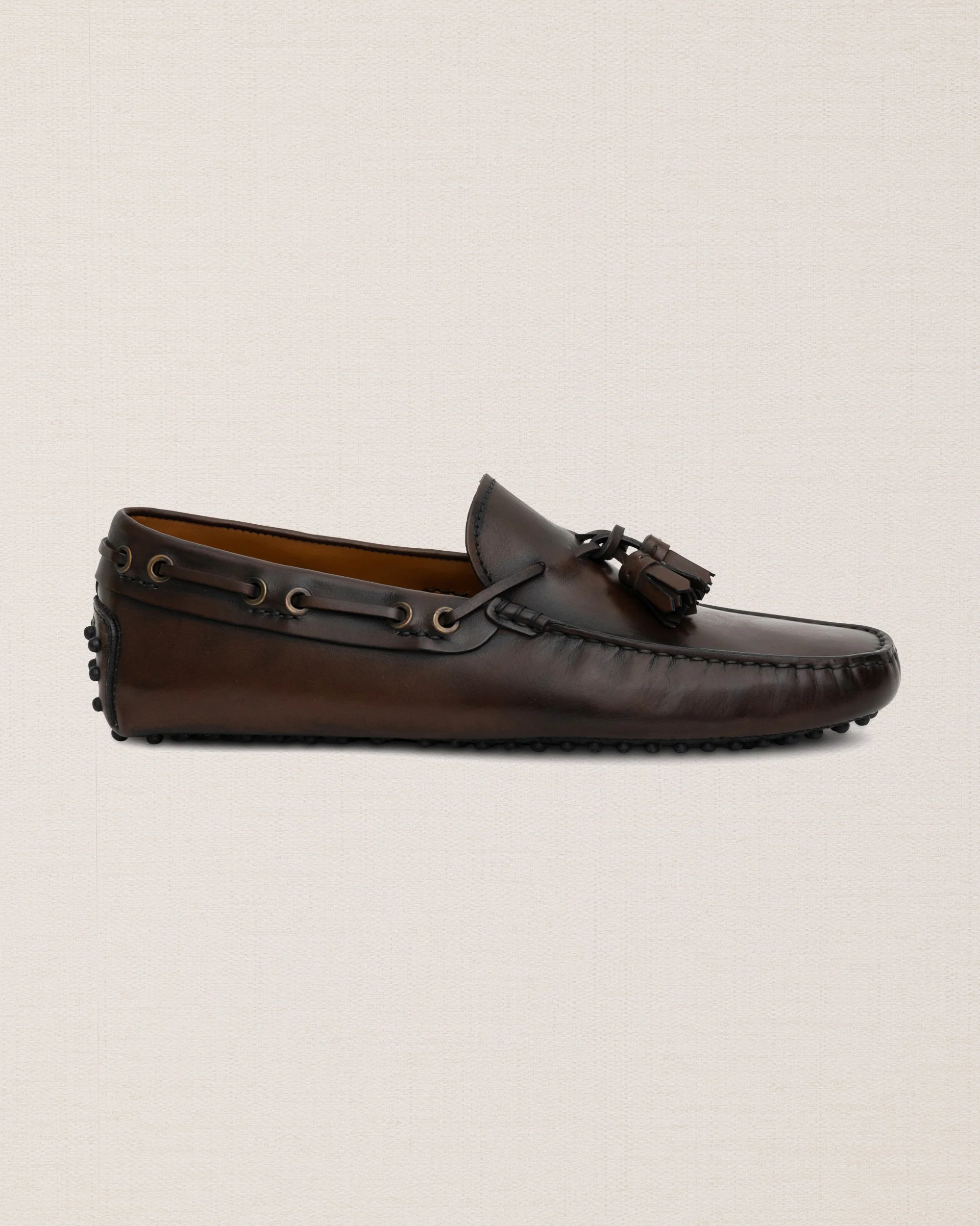 They the elegant Moccasin with something more: it comes with a tassel. With its antiqued leather and studded rubber sole, it’s a dark brown shoe on nice occasions. To wear without socks on summertime. The chosen construction is tubular: the foot is wrapped up like a glove - as you’re wearing a pair of slippers.